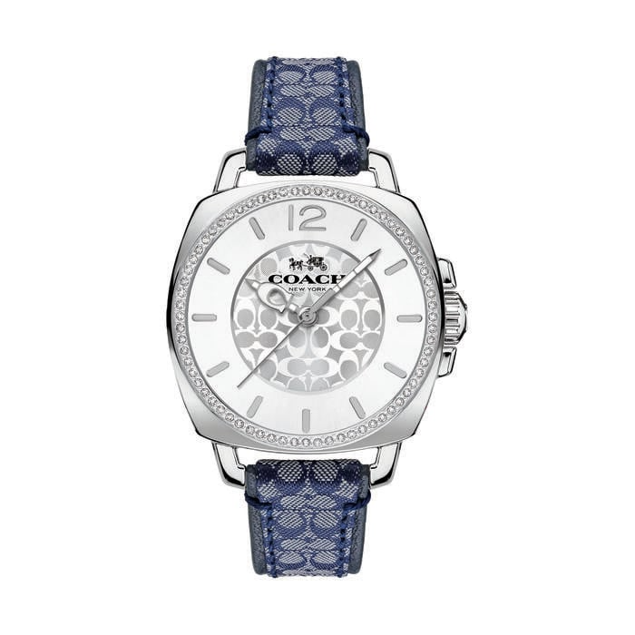 Coach Boyfriend, 34mm, stainless steel case, crystal set bezel, siliver white dial and navy signature C strap