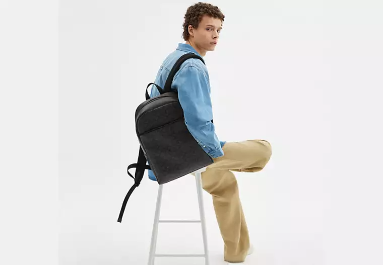 The Owen Backpack in Signature Canvas is your go-to companion for everyday adventures. Crafted of Signature coated canvas and smooth calf leather, this men’s work backpack has a classic and sleek design that never goes out of style. It features adjustable shoulder straps, an inside zip pocket and an outside zip pocket to carry everything you need with ease. There’s ample space to fit your large wallet, files or textbooks and a laptop up to 15-inches. Perfect for work, school or weekend getaways, this men’s canvas backpack adds effortless style to any outfit.