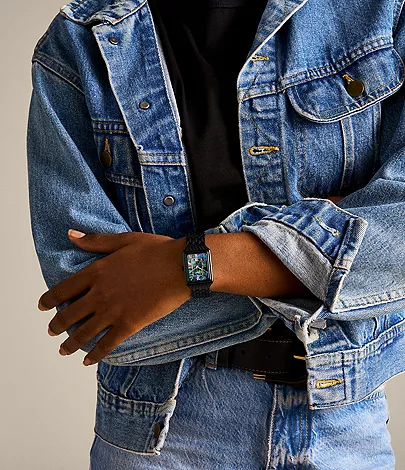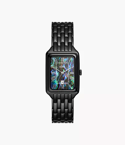 A true icon from our archive, the rectangular Raquel watch is updated with stunning details. Slim and versatile, it features a polished black genuine abalone shell dial, three-hand date movement and a polished black stainless steel seven-link bracelet.