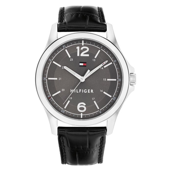 Tommy Hilfiger men’s stainless steel 45mm case, featuring a grey dial with a black leather strap.