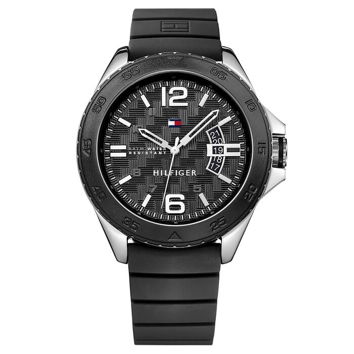 Tommy Hilfiger men’s 47 mm stainless steel case, black dial, black silicone strap