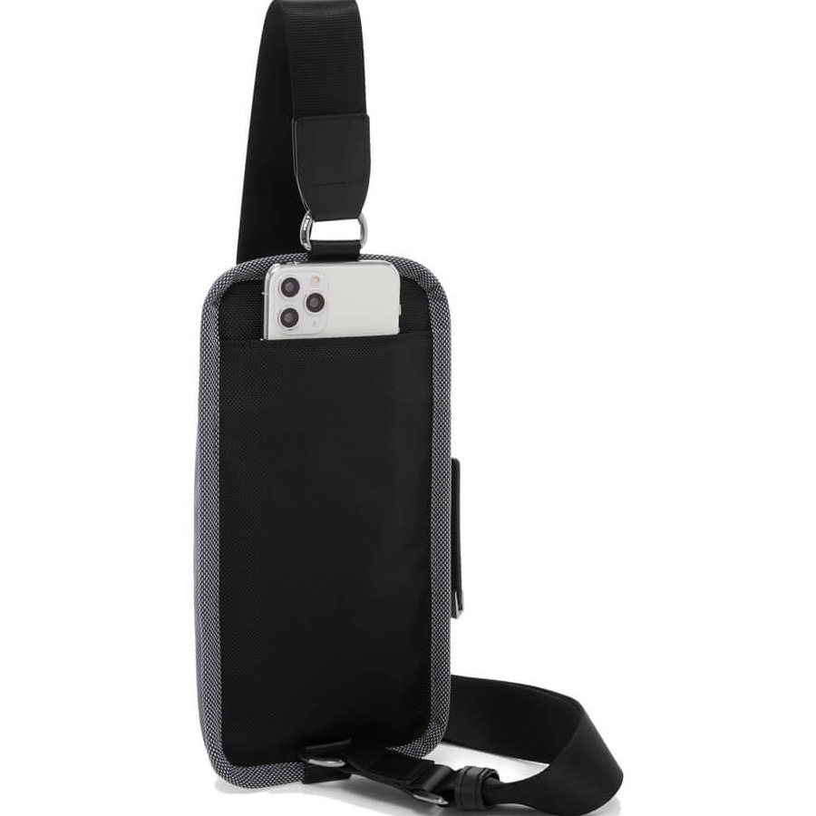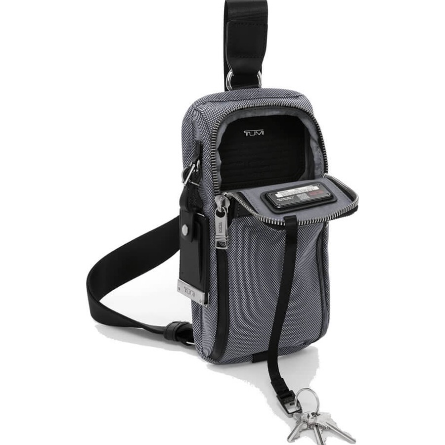 A compact TUMI sling for carrying daily essentials hands-free. The style is built with durable ballistic nylon and leather trim, finished with zip storage and an adjustable sling strap for easy everyday carry.