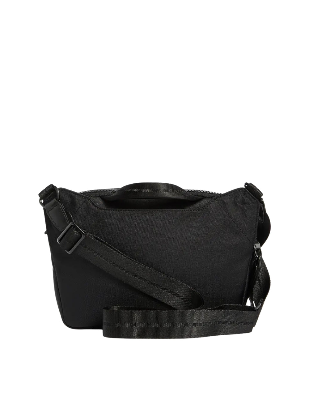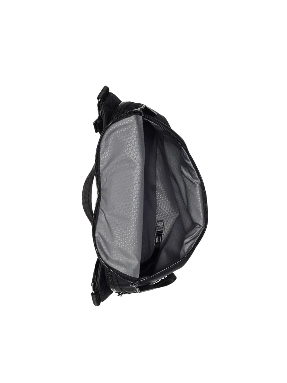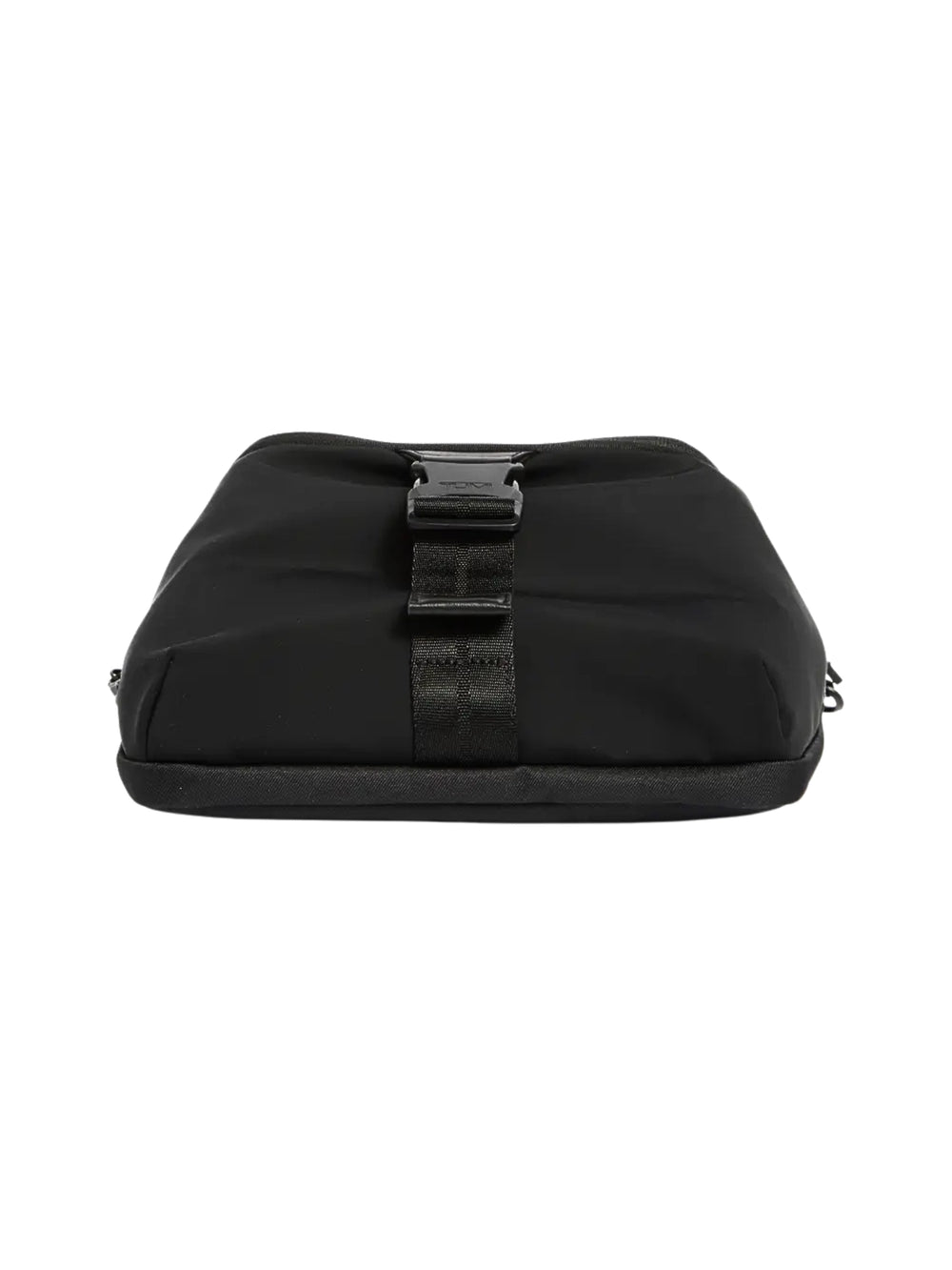 The TUMI Tahoe Dunlap Crossbody is a compact black carry bag with an adjustable webbing strap, zip main compartment, and front clip compression detail for secure everyday organization.