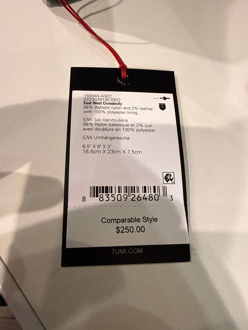 The TUMI East West Crossbody in Grey is a compact crossbody bag with a slim east-west profile, ballistic nylon body, leather trim, and polyester lining. It is designed for everyday essentials with a lightweight shape and zip-top access.