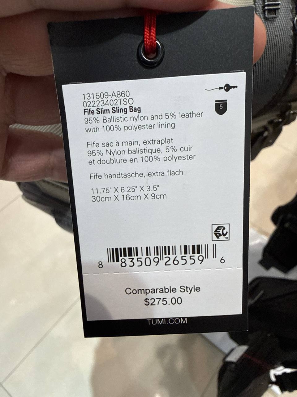The TUMI Fremont Fife Slim Sling Bag in Tonal Sand is a compact sling bag for everyday essentials, made with ballistic nylon and leather trim with a polyester lining. It has a slim profile, zip organization, and an adjustable strap for crossbody carry.