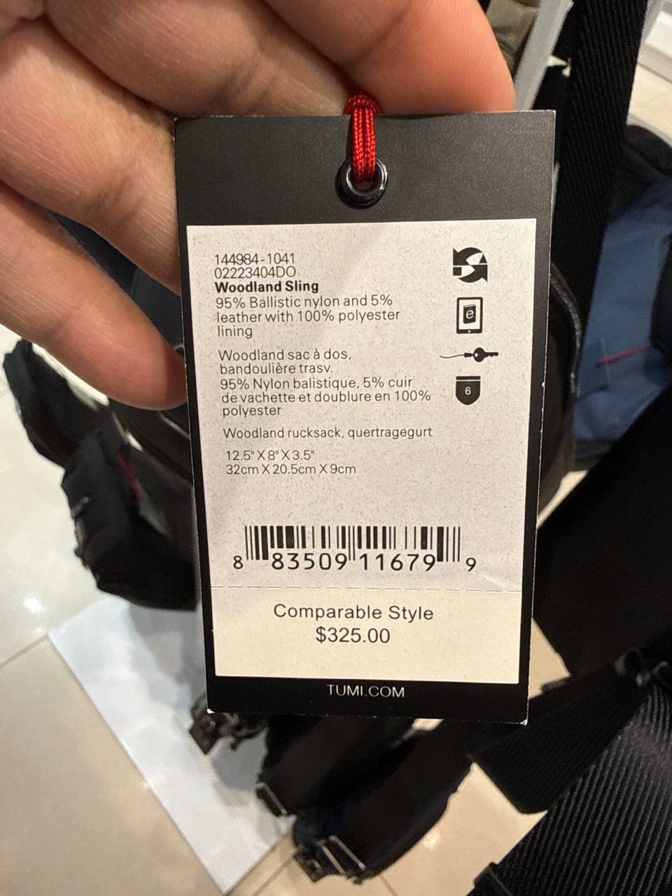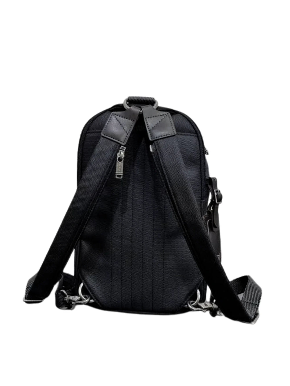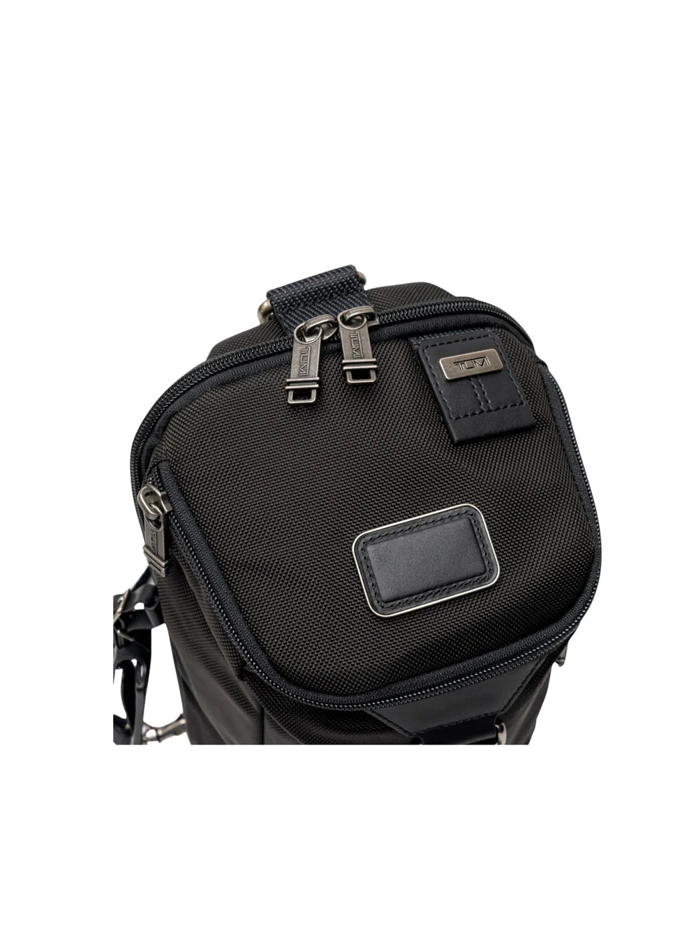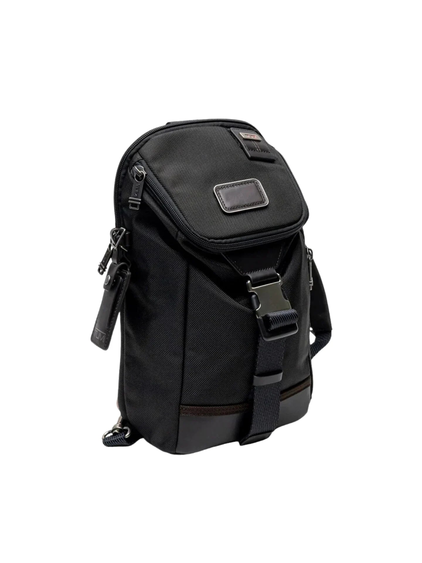 The TUMI Woodland Sling Bag 2 In 1 is a compact black sling bag with a convertible backpack option, zip closure, and practical pockets for everyday carry and travel organization.